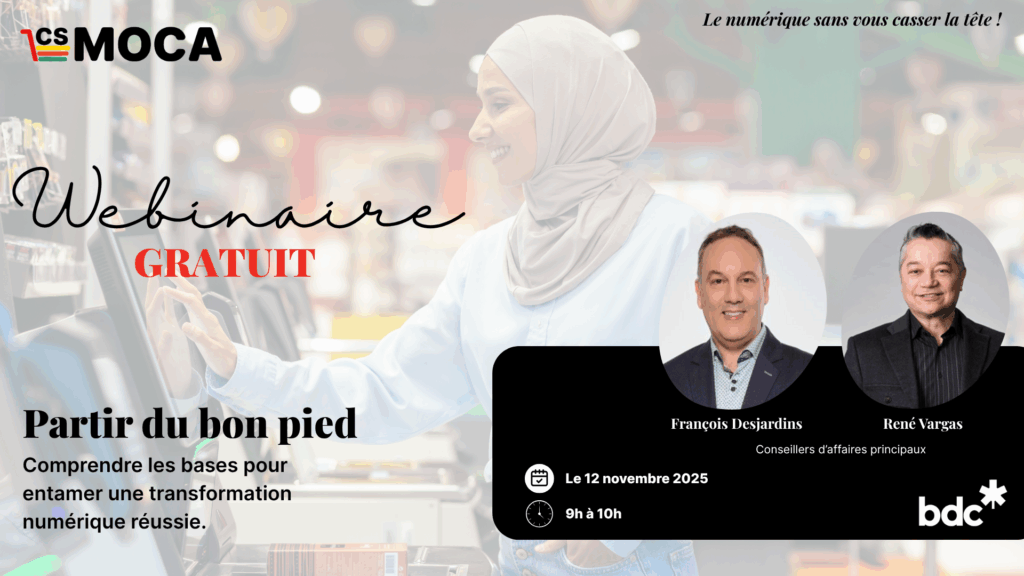 Le CSMOCA s’allie avec des experts en transformation numérique de la BDC et est heureux de vous présenter sa nouvelle série de webinaires gratuits : Le numérique sans vous casser la tête, dédiée aux détaillant·es du secteur du commerce de l’alimentation au Québec.